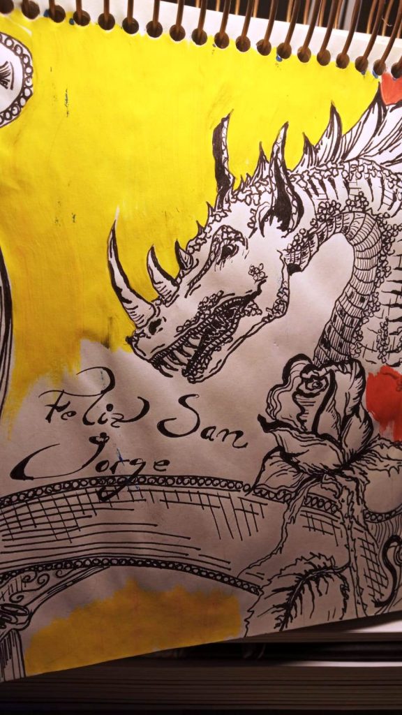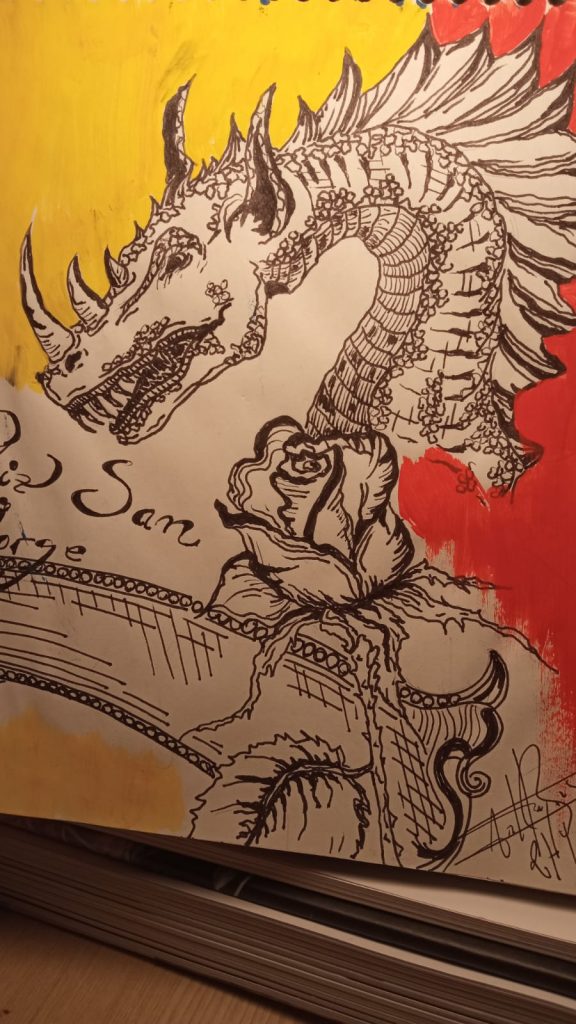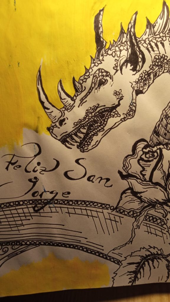Pero llegó el momento en que una princesa fue ofrendada a la bestia en su cueva, una princesa virgen. Y allá que fue San Jorge, mató al dragón, salvo a la princesa y como era santo repartió entre el pueblo las riquezas que por tal gesta a él le obsequiaron.