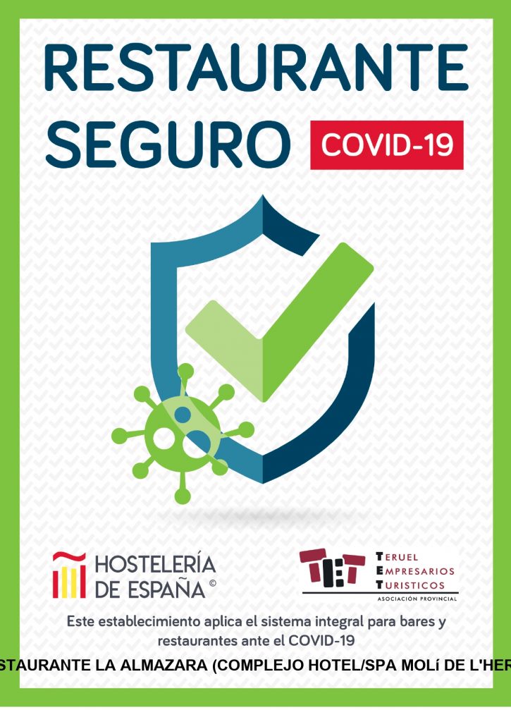Nuestro hotel y restaurante están certificados como Alojamiento Seguro y Restaurante Seguro, respectivamente, por Hostelería de España, Confederación Española de Hoteles y Alojamientos Turísticos (CEHAT) y Teruel Empresarios Turísticos (TET).